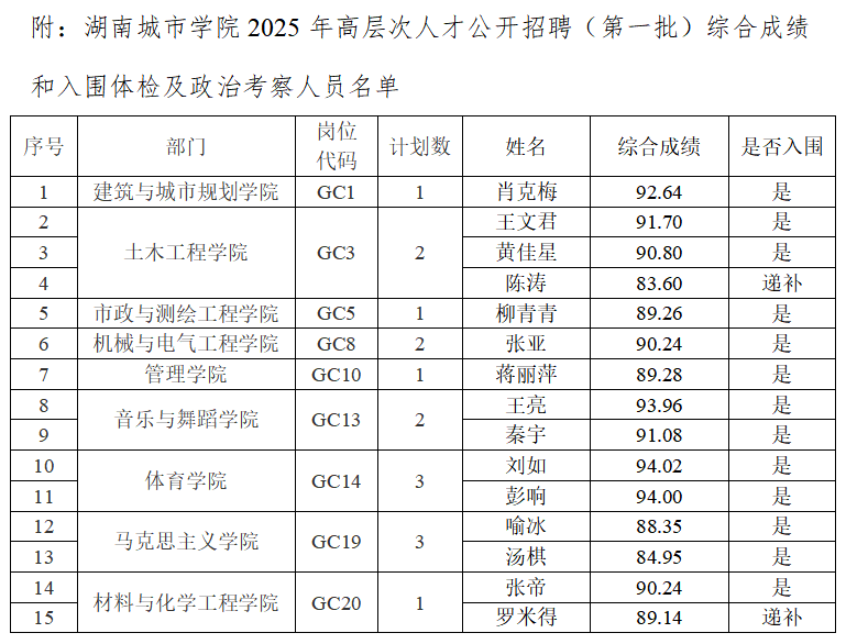 根据《湖南城市学院2025年高层次人才公开招聘公告》要求,经公开报名、资格审查、直接考核等环节,现将综合成绩和入围体检及政治考察人员名单予以公告(详见附表)。
